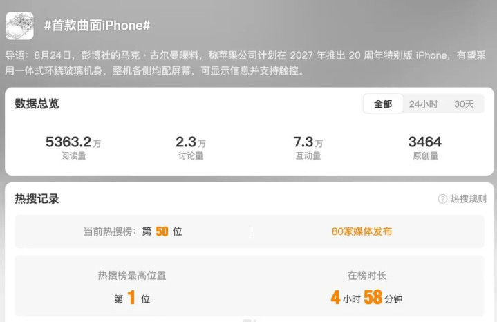 此前,#首款曲面iPhone# 这一话题就登上过热搜榜单,其中显示了 20 周年特别版 iPhone的外观设计信息。